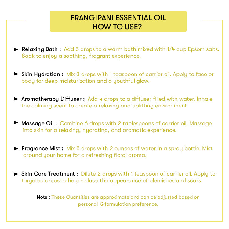 A: Frangipani Essential Oil is good for massage, skin, and hair care purposes.