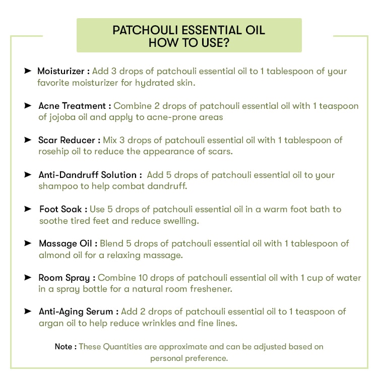 Relaxing and soothing aroma of organic Patchouli Essential Oil will help you to balance your emotions. While using it for aromatherapy, ensure that you do not apply it directly to your skin as it is a concentrated essential oil. Instead, you can combine it with a carrier oil or blend it in cosmetic application to dilute its effect on your skin.