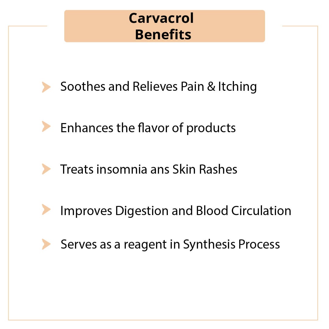 It has been investigated for its potential in promoting digestive health, supporting the immune system, and even exhibiting anticancer effects in some studies. The aromatic compound is also utilized in the fragrance and cosmetic industries, contributing to the pleasant aroma and flavor of various personal care products, perfumes, and household cleaners. Overall, carvacrol is a versatile compound that offers potential health benefits and aromatic qualities. Its presence in natural remedies, culinary applications, and fragrances highlights its significance in various aspects of everyday life.