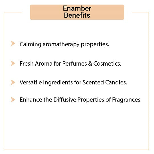 Enamber is a fragrance that contains a blend of woody, floral, and masculine notes. Used mainly for making perfume sprays for men, its unique scent can also be used in a wide range of cosmetics and personal care products. It comes in liquid form and appears pale yellow to golden yellow.