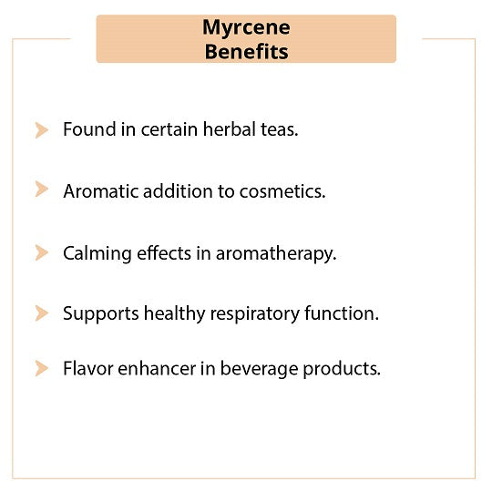 Beyond its aromatic allure, Myrcene's potential therapeutic properties have led to its exploration in natural medicine, believed to encompass relaxing and anti-inflammatory effects. As a bridge between nature's aromatic bounty and human exploration, Myrcene embodies the enchanting harmony of scent and well-being, offering a fragrant pathway to a more holistic connection with the natural world.