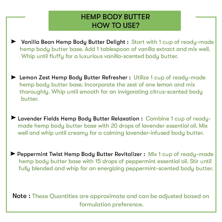 Our Unrefined and organic hemp butter is free from chemicals, parabens, sulfate, and pesticide. We ensure high-quality packaging standards are being followed to deliver the finest quality body butter at your doorsteps. You can Buy Hemp Body Butter Online from VedaOils for commercial use as wells as for your personal use at a discounted price. It has a perfect consistency, so it can be used easily for any DIY at your home.
