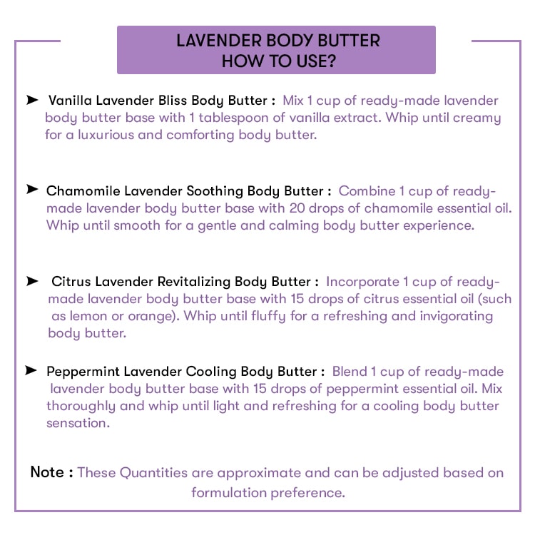 Rich emollient properties of pure lavender cleansing body butter makes it easy to blend with lotions, creams, and other skincare products like face creams, scrubs, and sunscreen lotions.