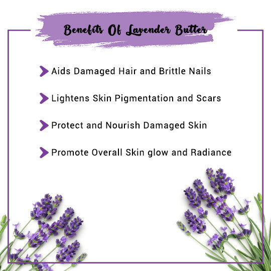 Anti-bacterial properties of lavender body butter that help in healing skin wounds and skin irritations like rashes, scars, and acne. It reduces blemishes, dark spots, and acne scars.