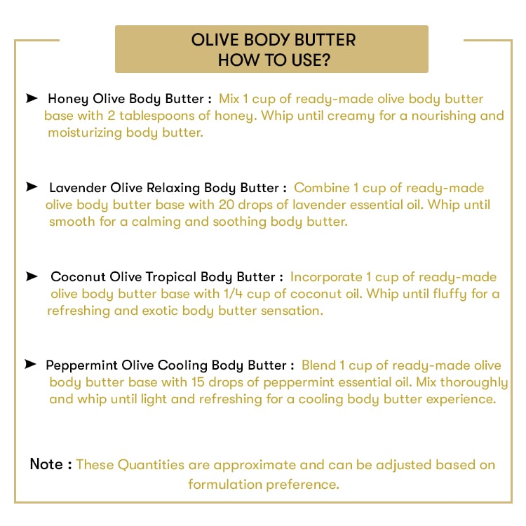 Stay super hydrated all day long with Natural Olive Body Butter that is loaded with goodness of natural olives. With a fresh and delicate smell of the olives, our Olive Body Butter is your perfect companion for dry skin this winter. As a rich emollient, olive oil body butter acts as a thick moisturizer and protects your skin from extreme dryness. Olive Body butter contains a base of shea butter and the extra goodness of natural olive extracts.