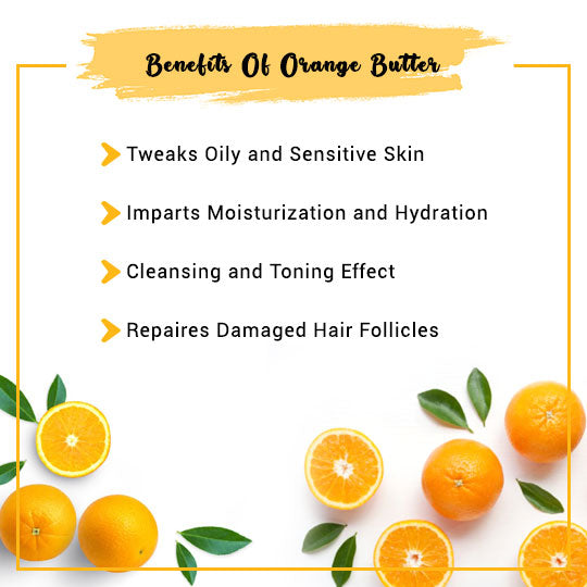 Unrefined orange butter is known to have numerous benefits for the skin such as reducing wrinkles, fine lines and other signs of ageing, along with increasing the elasticity of skin. Having a high fatty-acid content, it also helps in preventing acne and deeply cleanses any clogged pores, being rich in antioxidants. Whipped Orange Blossom Body Butter helps in providing your skin a clear and youthful appearance, along with benefiting your hair in numerous ways such as, in promoting hair growth, reducing hair fall, split-ends, strand breakage, dryness, and fizziness. Apart from this, it also helps in treating issues such as dandruff, itchy and dry scalp.