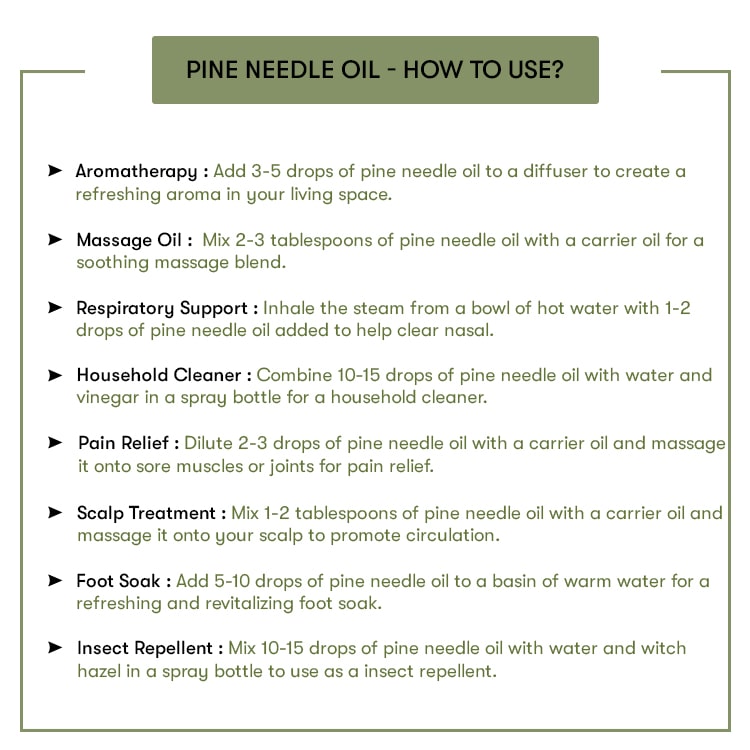 Pure Pine Needle Oil is gentle and does not cause any irritation or swelling after use. It is suitable for all skin types. However, as it is a concentrated oil, you will have to dilute it first before applying it to your skin. It can be used as a great odor neutralizer due to its strong woodsy aroma that can eliminate the foul odor and turns your place into a tranquilized space.