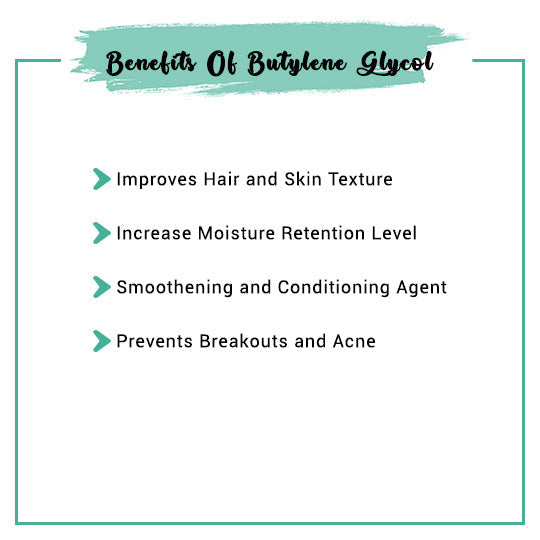 Natural Butylene Glycol is included in formulations for a wide range of skincare and haircare products because it helps add moisture and provides conditioning to your hair and skin. Also, it is completely safe for skin. It can function as a solvent, so as to keep other ingredients, dyes, and pigments from clumping up inside of a solution. Butylene glycol not only helps increase hydrate content in skin but also contributes to decreasing roughness of skin, thereby making it soft and supple.