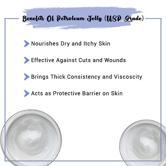 USP Grade Petroleum Jelly soothes rashes and can be effective against dry and cracked skin. It is also utilized for soothing diaper rashes and acts as a perfect ingredient for making DIY balms and body lotions. It prevents elbows, knees, from becoming dry.