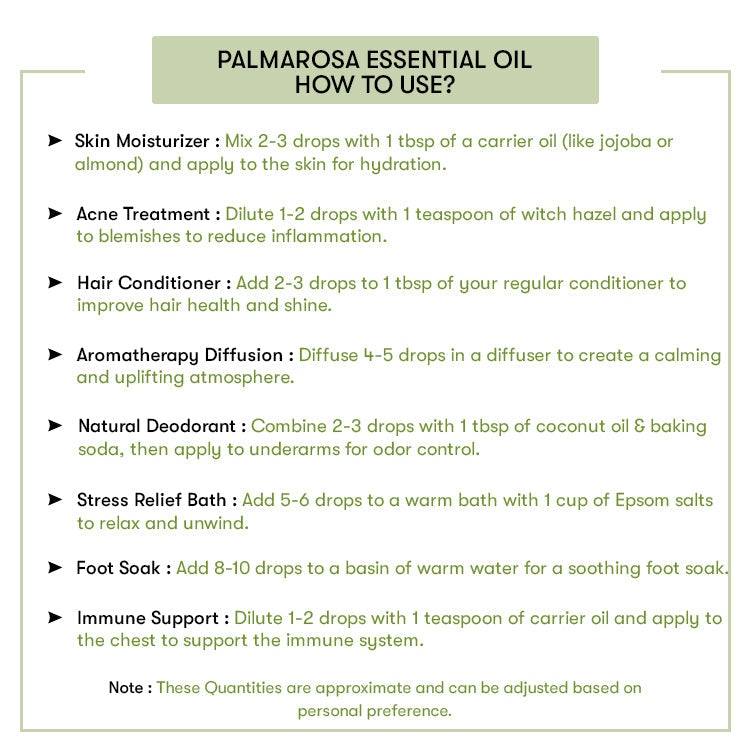 Extracted from the Palmarosa plant, a plant that belongs to the Lemongrass family and is found in India, the Palmarosa Essential Oil is known for its several medicinal benefits. It is a grass that also has flowering tops and contains a compound called Geraniol in good proportion.