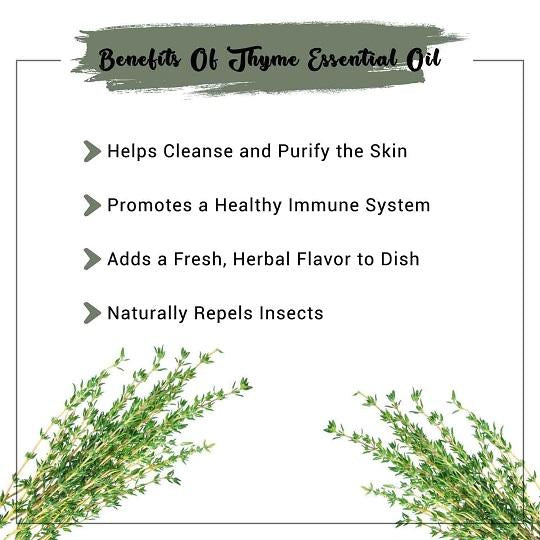 Used in aromatherapy as it keeps the atmosphere pleasant and germ-free when diffused. As it is a highly concentrated oil, you must combine it with a carrier oil before massaging it on your skin. Apart from skincare, You can also use Thyme Essential oil for hair growth and other hair care purposes. Antibacterial and Antifungal properties of Thyme Essential Oil can be used to treat skin infections.