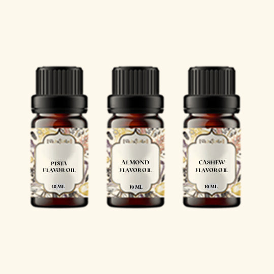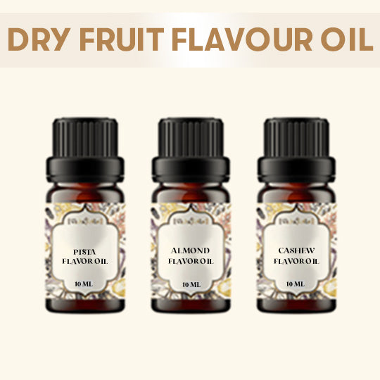 Discover a world of vibrant flavours with our Dry Fruit Flavor Oil Sample Kit. Our Dry fruit-flavour oil sample kit typically includes small bottles of oils infused with natural fruit flavours, such as pista, almond & Cashew. These kits are perfect for experimenting with unique flavours in Baking, Beverages, Candy-making, Juices and Shakes, Confectionary Items & Bakery Items. Sample kits allow you to try different dry fruit flavours without committing to large quantities, making them a convenient way to explore various options for flavour enhancement.Dry Fruit Flavour Oil Sample Kit Uses
