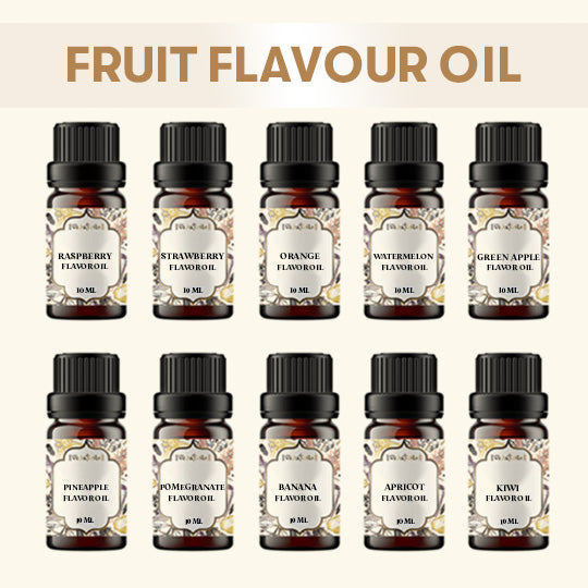 Discover a world of vibrant flavours with our Fruit Flavor Oil Sample Kit. A fruit-flavour oil sample kit typically includes small bottles of oils infused with natural fruit flavours, such as Citrus, berries, apple, or tropical fruits. These kits are perfect for experimenting with unique flavours in Baking, Beverages, Candy-making, Juices and Shakes, Confectionary Items & Bakery Items. Sample kits allow you to try different fruit flavours without committing to large quantities, making them a convenient way to explore various options for flavour enhancement.Fruit Flavour Oil Sample Kit Uses