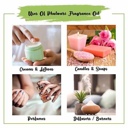 - Bath Oils: Adding 5 to 5 drops of our natural Phulwari Fragrance Oil in a bathtub will enable you to enjoy a relaxing bathing experience. It will help to calm your body and relax your senses.