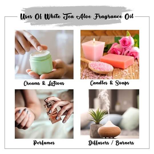 - Skin Care & Cosmetic Products: Mild and gentle scented cosmetic products are made using white tea & aloe fragrance oil in very little proportion to not react to the skin.