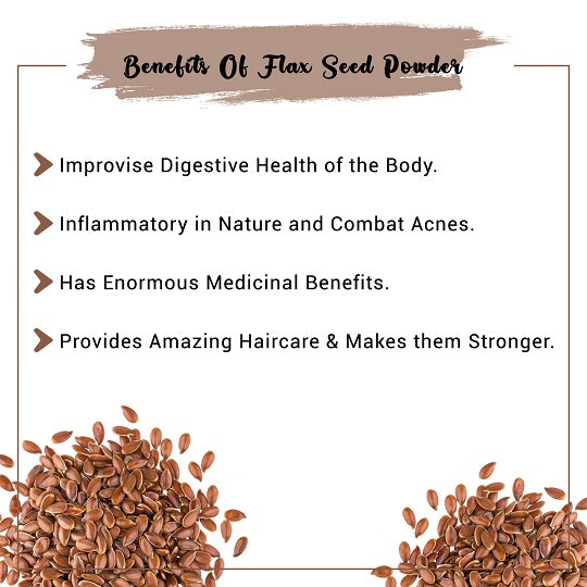 Flax Seed Powder is free from all the artificial colors and preservatives. It is 100 percent safe and natural for the skin. Use the powder to prevent constipation, high cholesterol, cancer, heart diseases. It includes protein, fiber, fatty acids. The powder is used by women to enhance their beauty and get nourished skin. Organic Flax Seed Powder has properties that delay the signs of aging. It is antibacterial, anti-viral, and anti-fungal in nature and prevents skin and hair infections.