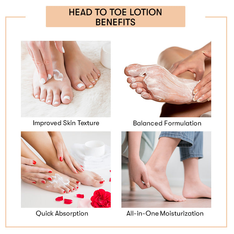 Head to Toe Lotion is a versatile skincare essential designed to provide comprehensive nourishment for your entire body. Enriched with a blend of hydrating ingredients, this lotion caters to the unique needs of both face and body. Its lightweight formula absorbs quickly, leaving the skin feeling moisturized and revitalized without greasiness. Packed with vitamins and antioxidants, Head to Toe Lotion promotes overall skin health, making it a convenient and effective solution for daily hydration, ensuring a smooth and radiant complexion from head to toe.Head to Toe Lotion Uses & Benefits