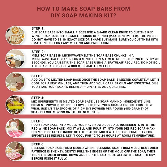 Equipment: With our Red Wine Soap Making Kit, you'll experience a safe soap-making process since we provide equipment and supplies that keep your hands clean during the process.