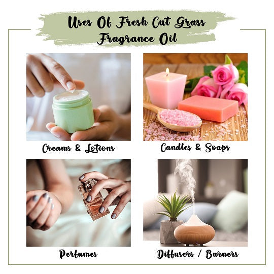 - Skin Care & Cosmetic Products: Mild and gentle scented cosmetic products are made using Fresh Cut Grass fragrance oil in very little proportion to not react to the skin.