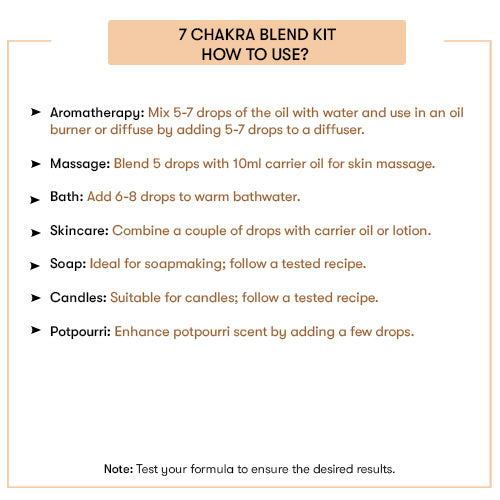 The Chakra Essential Oil Blend Kit is carefully created to balance the energy center linked to spirituality and awareness. By blending sacred oils like Cedarwood and Frankincens, it encourages a connection to higher consciousness. Whether diffused or applied, the blend induces serenity, supporting spiritual growth and fostering a sense of divine connection.Chakra Essential Oil Blend Kit - How to Use?