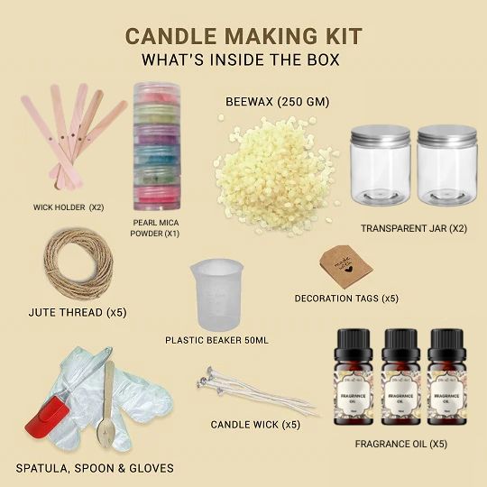 Our Beewax Candle Making Kit comes with candle jars, beeswax, color pigments, fragrance oils, candlewick, beaker, spatula, hand gloves, and jute thread for decoration purposes. It also consists of a manual that explains how to make scented candles. The process is so easy that you can even make them at your home. Our Candle Making Kit Set is so reasonable that manufacturers of scented candles can buy them for commercial use. You can also gift DIY Candle Making Kit to yourself or give them to someone who makes or is interested in making aromatic candles!