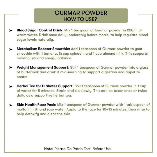 Gurmar powder is known as madhunashini powder and scientifically as Gymnema Sylvestre powder. The powder is herbal and completely gluten-free. No fillers or preservatives are added to it. Gurmar powder is 100 per cent natural and safe for the skin.