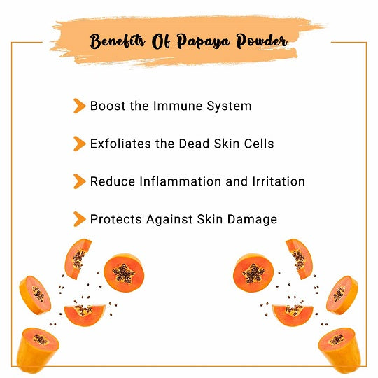 Papaya Powder is made from the ripe and juicy Papayas (Carica Papaya) and is used widely in skincare formulations as it is completely natural and free from chemicals. In addition, it is rich in Vitamin A, which imparts a radiant glow to your skin, and it is also rich in Vitamin C, which is known for its skin protection properties.